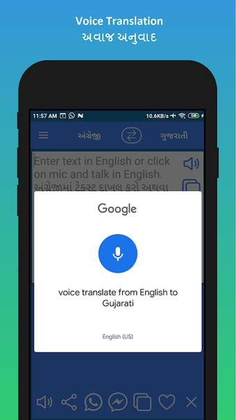 The English to Gujarati Translator can also be used as a dictionary. Users can type words in English and get the exact translation in Gujarati, or type words in Gujarati and get the English translation. The app also offers the option to share translated text to other apps or directly to WhatsApp and FB Messenger.